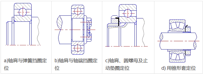 滾動(dòng)軸承內外圈的定位與固定的方法很多,下列為幾種常用的方法。